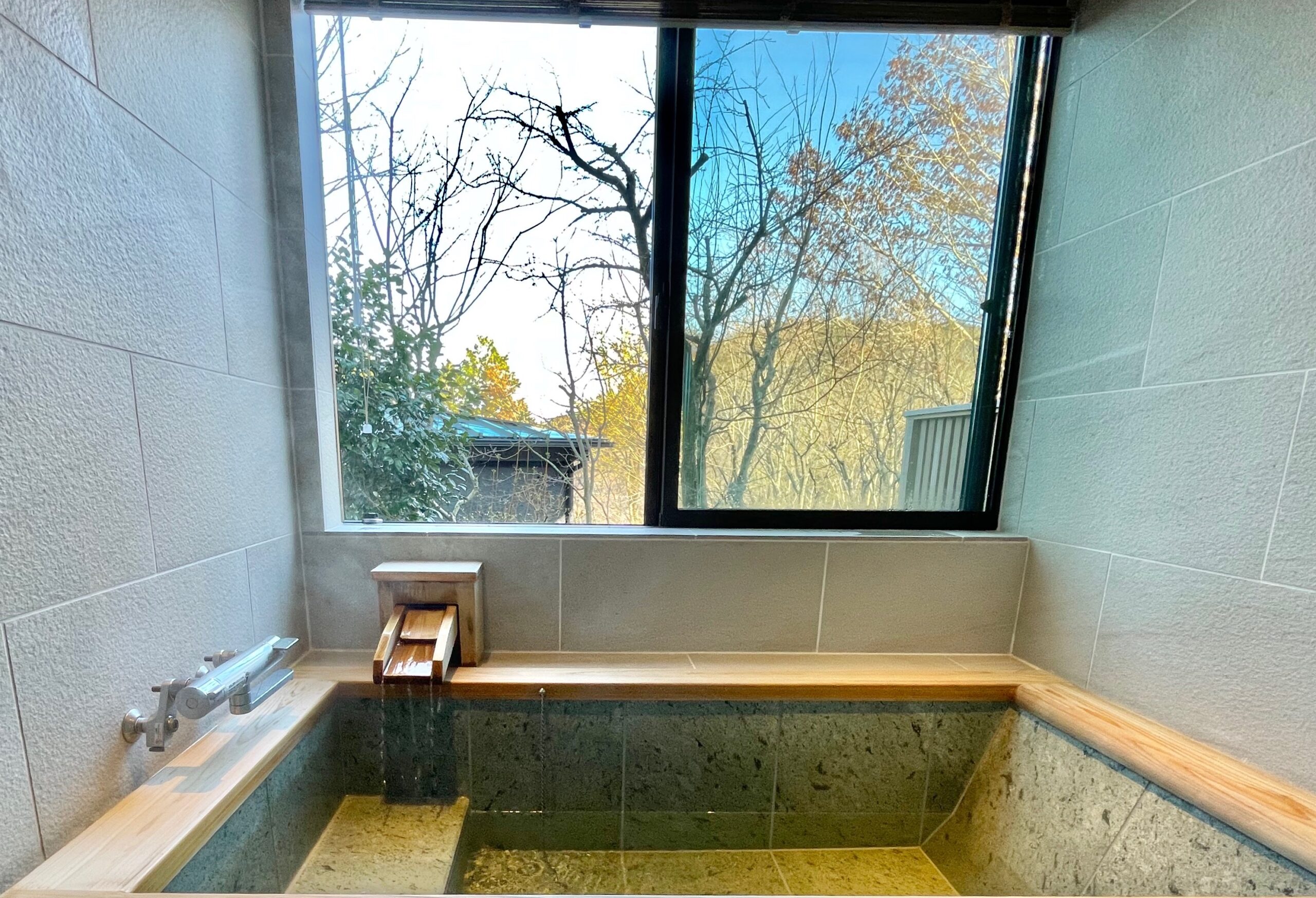 源泉は小涌谷温泉で、弱アルカリ性で無色透明無臭です。窓から豊かな景色を眺めが飛び込んできます。